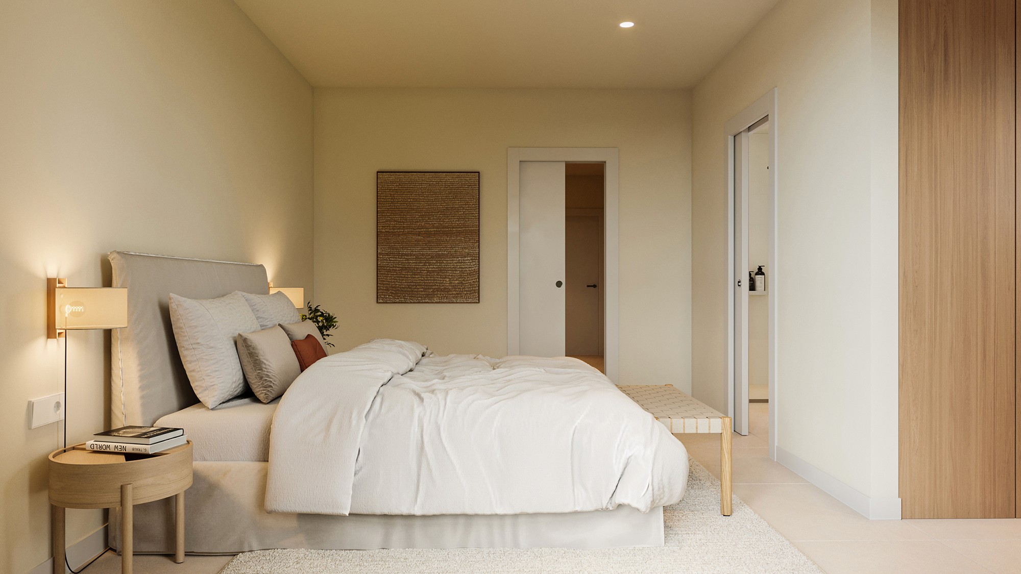 Armored entrance door with security lock and peephole, finished in matte white lacquer on the inside and in line with the communal areas outside. Interior doors made of moisture-resistant MDF, matte white lacquered, with matte chrome steel handles. Modular block-type wardrobes with matte white lacquered smooth doors, lined interiors, hanging rail, and shelf.