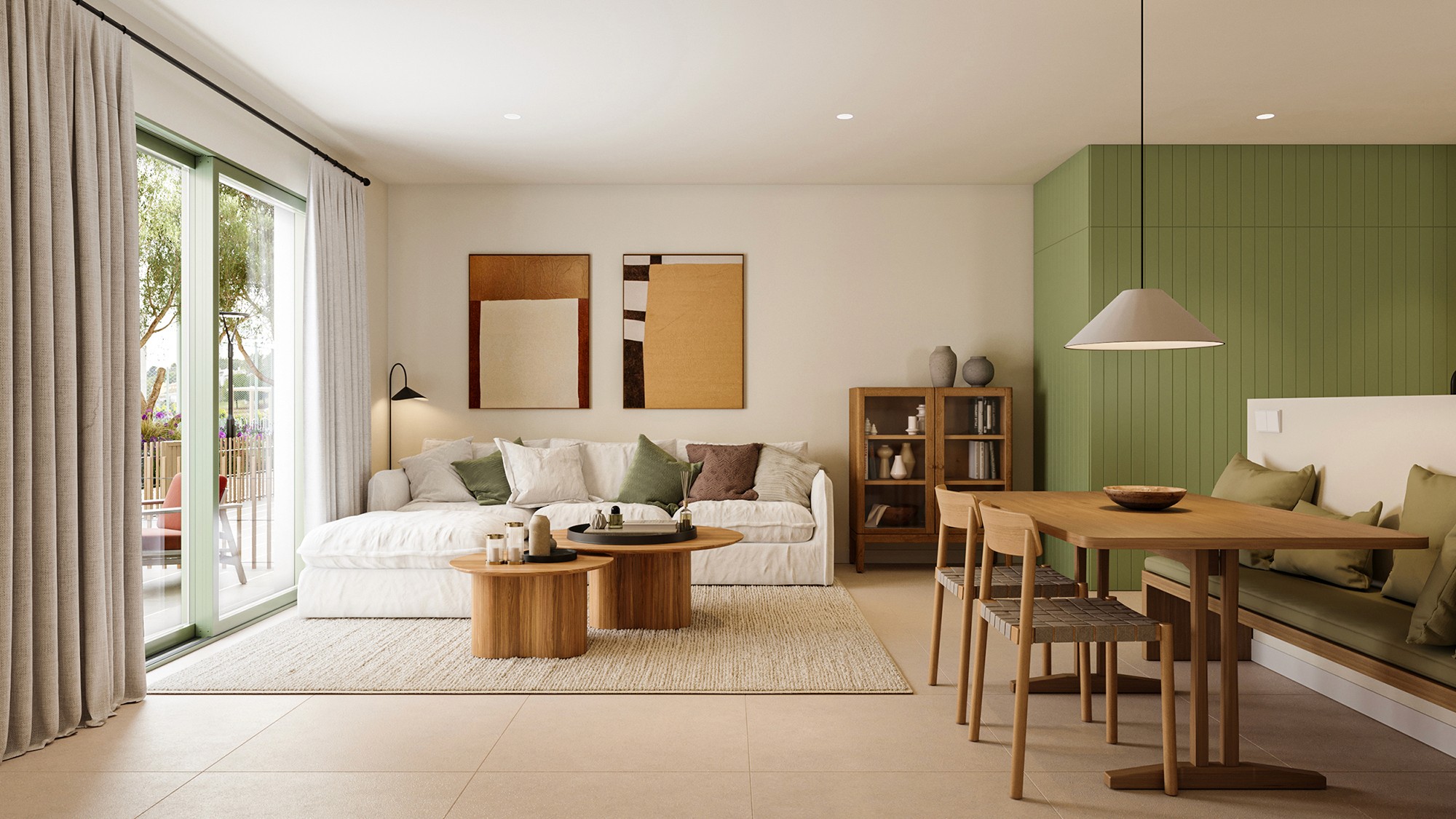 Interior flooring in large-format national porcelain tile. Terraces finished with the same porcelain tile in an anti-slip version.