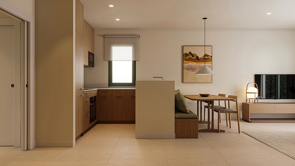 The kitchen backsplash will be tiled in porcelain or similar material matching the countertop. High-quality, designer furniture in matte laminated wood finish. Sink and faucet from top brands, with chrome finish. Appliances include built-in refrigerator and dishwasher, oven, microwave, induction hob, and extractor hood, all from Balay’s mid-range line.